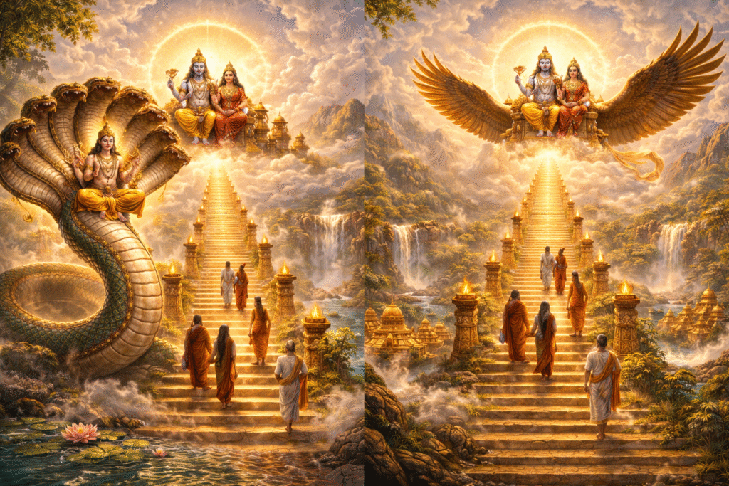 ಸಹೋದರರಾಗಿ ಹುಟ್ಟಿದ್ದರೂ, ಒಬ್ಬನು ಪರಾಕ್ರಮದಿಂದ ವಿಷ್ಣುವಿನ ವಾಹನವಾದರೆ, ಇನ್ನೊಬ್ಬನು ವೈರಾಗ್ಯದಿಂದ ವಿಷ್ಣುವಿನ ಹಾಸಿಗೆಯಾದನು. ಅವರ ಮಾರ್ಗಗಳು ಬೇರೆಯಾದರೂ, ಇಬ್ಬರೂ ನಿಷ್ಕಲ್ಮಶ ಭಕ್ತಿಯಿಂದ ಪರಮೋಚ್ಚ ದೈವಿಕ ಸ್ಥಾನವನ್ನು ಪಡೆದರು.