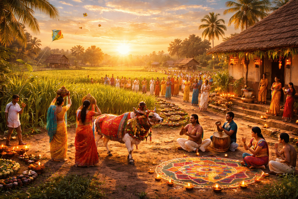 “ಇನ್ನು ಹಳ್ಳಿಗಳಲ್ಲಿ ಈ ದಿನ ದನಕರುಗಳಿಗೆ ಸ್ನಾನ ಮಾಡಿಸಿ ಕೊಂಬುಗಳಗೆ ಬಣ್ಣ ಹಚ್ಚಿ ಆಲಂಕಾರ ಮಾಡಿ ‘ಕಿಚ್ಚು ಹಾಯಿಸಲಾಗುತ್ತದೆ’. ರೈತರು ತಾವು ಬೆಳೆದ ಬೆಳೆಗಳನ್ನು ಕಣಗಳಲ್ಲಿ  ರಾಶಿ ಮಾಡಿ ಪೂಜೆ ಮಾಡುತ್ತಾರೆ. ಅದರಾಲ್ಲು ವಿಶೇಷವಾಗಿ ಈ ದಿನ ಸಣ್ಣ ಮಕ್ಕಳಿಗೆ ಆರೋಗ್ಯ ವೃದ್ಧಿಯಾಗಲೆಂದು ಫಲ ಎರಿತಾರೆ, ಎಳ್ಳು-ಬೆಲ್ಲ,ಕಬ್ಬಿನ ಜೊತೆ ಫಲವನ್ನು ಸೇರಿಸಿ ತಲೆಯ ಮೇಲೆ ಎರೆದು ದೃಷ್ಟಿ ತೆಗೆಯುವ ಸಂಪ್ರದಾಯ ತುಂಬಾ ಹಿಂದಿನಿಂದ ನಡ್ಕೊಂಡು ಬಂದಿದ್ದು ಇದು ಕೂಡ ಸಮೃದ್ಧಿಯ ಸಂಕೇತ . ಹೊಸ ಅಕ್ಕಿಯಿಂದ  ಸಿಹಿಯಾದ ಉಗ್ಗಿ ‘ಪೊಂಗಲ್’ ಮಾಡಿ, ಮನೆ,ಮೆನೆಗೆ ಹೋಗಿ ಪ್ರೀತಿಯಿಂದ ಎಳ್ಳು-ಬೆಲ್ಲ ಹಂಚುವುದು ಈ ಹಬ್ಬಕ್ಕೆ ಒಂದು ಸೊಬಗು ನೀಡತ್ತೆ.”