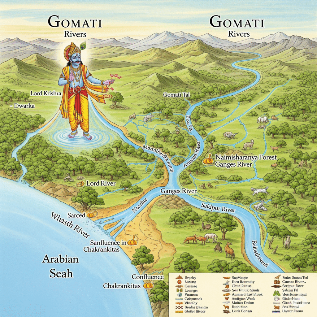 ಪವಿತ್ರ ಭಾರತದಲ್ಲಿ ಗೋಮತೀನದಿಗಳು ಎರಡು ಇವೆ. ಶ್ರೀ ಕೃಷ್ಣನ ದಿವ್ಯಸನ್ನಿಧಾನವೆನಿಸಿದ ದ್ವಾರಕೆಗೆ 10 ಕಿಲೋಮೀಟರುಗಳ ಹಿಂದೆ ಹುಟ್ಟಿ, ಕೃಷ್ಣನ ಪಾದಸ್ಪರ್ಶದಿಂದ ಪೂತವಾಗಿ, ನೇರವಾಗಿ ಸಮುದ್ರರಾಜನನ್ನು (ಅರೇಬಿಯಾ ಸಮುದ್ರವನ್ನು) ಸೇರುವ ಮಹಾನದಿ ಮೊದಲನೆಯದು. ಈ ನದಿಯ ಉಗಮಸ್ಥಾನಕ್ಕೆ ಗೋಮರಿಘಾಟ್‌ ಎನ್ನುತ್ತಾರೆ. ಗಂಡಕೀಯಲ್ಲಿ ಸಾಳಗ್ರಾಮಗಳು ದೊರೆಯುವಂತೆ, ಈ ನದಿಯು ಸಮುದ್ರವನ್ನು ಸೇರುವ ಸ್ಥಳದಲ್ಲಿ, ವಿಷ್ಣು ಸನ್ನಿಧಾನದಿಂದ ಯುಕ್ತಗಳಾದ ಚಕ್ರಾಂಕಿತಗಳು ದೊರೆಯುತ್ತವೆ. ಎರಡನೇ ಗೋಮತೀನದಿಯ ಉಪನದಿ ಭಾರತದ ಮಾಧೋತಾಂಡದ ಸಮೀಪದಲ್ಲಿರುವ ಗೋಮತೀತಾಲ್‌ ಎಂಬಲ್ಲಿ ಹುಟ್ಟಿ, 900ಕಿ.ಮೀ.ಗಳಷ್ಟು ಪ್ರಯಾಣ ಮಾಡಿ ಉತ್ತರಪ್ರದೇಶದಲ್ಲಿಯ ಸಯಿದ್‌ಪುರದಲ್ಲಿ ಗಂಗೆಯೊಡನೆ ಸಂಗಮಿಸುವುದು. ಈ ನದಿಯ ತೀರದಲ್ಲಿ ಅನೇಕ ಪುರಾಣಗಳ ಪ್ರಾದುರ್ಭಾವಕ್ಕೆ ಕಾರಣವಾದ ನೈಮಿಷಾರಣ್ಯವಿದೆ.