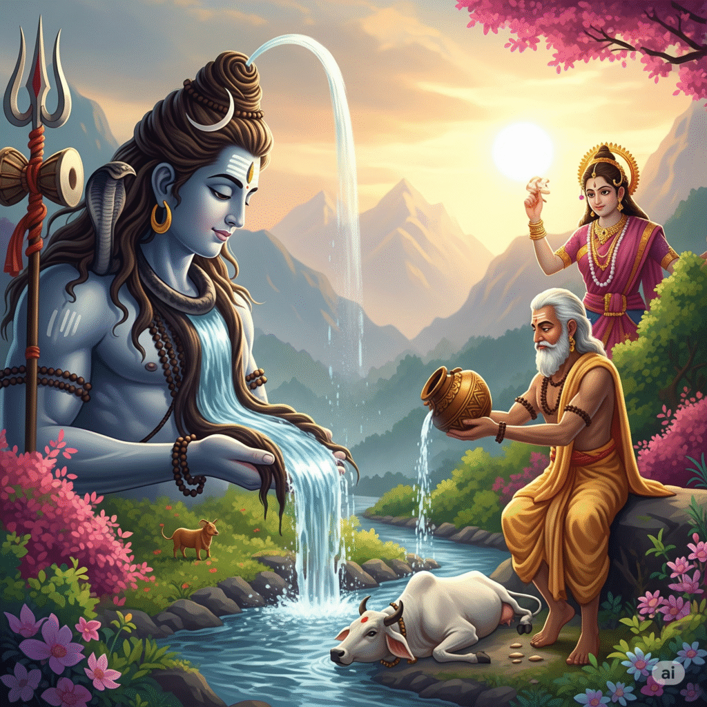 ಹಿಂದೂ ಪುರಾಣಗಳಲ್ಲಿ ಭಗೀರಥನು ತನ್ನ ಪೂರ್ವಜರಿಗೆ ಮೋಕ್ಷವನ್ನು ನೀಡಲು ಗಂಗಾ  ನದಿಯನ್ನು ಭೂಮಿಗೆ ತಂದನು. ಭಗೀರಥನ ಪೂರ್ವಜರು ಶಾಪಗ್ರಸ್ತರಾಗಿದ್ದರು ಮತ್ತು ಅವರಿಗೆ ಗಂಗಾ ನೀರು ಮುಕ್ತಿ ನೀಡಬೇಕಾಗಿತ್ತು ಎಂಬ ಕಾರಣದಿಂದಾಗಿ ಇದು ಸಂಭವಿಸಿತು. ಭಗೀರಥನು ವರ್ಷಗಳ ಕಾಲ ತಪಸ್ಸು ಮಾಡಿ ಬ್ರಹ್ಮನಲ್ಲಿ ಬೇಡಿಕೊಂಡನು, ಅಂತಿಮವಾಗಿ ಬಹ್ಮದೇವನು ದೈವಿಕ ನದಿಯನ್ನು ಸ್ವರ್ಗದಿಂದ ಭುವಿಗೆ ಕಳುಹಿಸಲು ಒಪ್ಪಿಕೊಂಡನು ಮತ್ತು ಸ್ವರ್ಗೀಯ ನಿವಾಸದಿಂದ ಬಿಡುಗಡೆ ಮಾಡಿದನು. ಅದರೇ ಭೂಮಿಯು ಅವಳ ಪೂರ್ಣ ಶಕ್ತಿಯನ್ನು ತಡೆದುಕೊಳ್ಳಲು ಸಾಧ್ಯವಾಗದ ಕಾರಣ ಭಗೀರಥನು ಶಿವನನ್ನು ಗಂಗೆಯ ಬಲವನ್ನು ನಿಯಂತ್ರಿಸುವಂತೆ ಶಿವನ ಮೊರೆಹೋದ ಭಗೀರಥನ ತಪಸ್ಸಿನಿಂದ ಪ್ರಭಾವಿತನಾದ ಶಿವನು, ಗಂಗೆಯ ಹರಿವನ್ನು ತನ್ನ ಕೂದಲಿನಲ್ಲಿ ಹಿಡಿದು, ತನ್ನ ಜಡೆಯ ಸುರುಳಿಗಳಲ್ಲಿ ಬಂಧಿಸಿ, ಅವಳ ಅವತಾರವು ಮೃದುವಾಗಿರುವುದನ್ನು ಖಚಿತಪಡಿಸಿಕೊಂಡನು. ಒಂದು ಸಣ್ಣ ಹನಿ ಮಾತ್ರ ಭೂಮಿಗೆ ಹರಿಯಲು ಬಿಟ್ಟನು. ಶಿವನ ಜಟೆಯಿಂದ ಧರೆಗೆ ಇಳಿದ ಗಂಗೆಯು, ರಭಸದಿಂದ ಗುಡ್ಡಕಾಡುಗಳಲ್ಲಿರುವ ಗಿಡಮರಗಳನ್ನು,ಬಂಡೆ ಕಲ್ಲುಗಳನ್ನು ಬದಿಗೋತ್ತುತ್ತಾ ಭಗೀರಥನನ್ನು ಅನುಸರಿಸಿದಳು. ರಾಜನ ರಥವು ಮುಂದೆ ನಡೆದಿದೆ. ಮಾರ್ಗಮಧ್ಯದಲ್ಲಿ ಜಹ್ನುಋಷಿಗಳ ಆಶ್ರಮ ಬಂತು. ಜಹ್ನುಋಷಿಗಳು ಮಹಾ ತಪಸ್ವಿಗಳು, ಶಾಪಾನುಗ್ರಹಶಕ್ತರು. ಗಂಗೆ ರಭಸದಿಂದ ಜಹ್ನುಋಷಿಗಳ ಆಶ್ರಮವನ್ನು ಹಾಳುಮಾಡಿದಳು. ಭಗೀರಥನು ಇದನ್ನು ಗಮನಿಸಲಿಲ್ಲ. ಜಹ್ನುಋಷಿಗಳು ಕೋಪತಾಪತಪ್ತರಾದರು ಮತ್ತು ತಕ್ಷಣ ಗಂಗೆಯನ್ನು ತಮ್ಮ ಯೋಗಶಕ್ತಿಯಿಂದ ವಿಶಾಲವಾಗಿ ಬಾಯಿತೆಗೆದು ಒಂದು ಗುಟುಕಿನಂತೆ ಗಂಗೆಯನ್ನು ಕುಡಿದುಬಿಟ್ಟರು. ಗಂಗೆ ಕಾಣದಾದಳು. ಭಗೀರಥ ಹಿಂತಿರುಗಿ ನೋಡಿದಾಗ, ಗಂಗೆಯ ಸುಳುವೇ ಇಲ್ಲ. ರಾಜ ಭಯಭೀನಾಗಿ ಅಗಸ್ತ್ಯರ ಬಳಿಗೆ ಓಡಿಬಂದ, ಶರಣಾಗತನಾದ ರಕ್ಷಿಸಲು ಮೊರೆ ಇಟ್ಟ. ಭಗೀರಥನಿಗೆ ಜಹ್ನುಋಷಿಗಳ ತಪ್ಪಸ್ಸಿನ ಪ್ರಭಾವದ ಪರಿಚಯವಾಯಿತು. ತನ್ನ ವೃತ್ತಾಂತವೆಲ್ಲವನ್ನು ಋಷಿಗಳ ಸನ್ನಿಧಿಯಲ್ಲಿ ವಿಜ್ಞಾಪಿಸಿಕೊಂಡನು. ತನ್ನ ಪೂರ್ವೀಕರನ್ನು ಕರುಣಿಸಬೇಕೆಂದು ಪ್ರಾರ್ಥಿಸಿದನು. ಪಾನಮಾಡಿದ ಗಂಗೆಯನ್ನು ಹೊರಗೆ ಬಿಟ್ಟು ಉದ್ದರಿಸಲು ಬೇಡಿದ. ಕರುಣಾಮೂರ್ತಿಗಳಾದ ಜಹ್ನುಋಷಿಗಳು ಪುಣ್ಯಾತ್ಮನಾದ, ಪಿತೃದೇವತೆಗಳಲ್ಲಿ ಶ್ರೆದ್ಧೆಯುಳ್ಲ ಭಗೀರಥನ ಪ್ರಾರ್ಥನೆಯಿಂದ ಪ್ರಸನ್ನರಾದರು. ತಮ್ಮ ತಪಶಕ್ತಿಯಿಂದ ಚುಲಕಪ್ರಾಯವಾಗಿ ಪಾನಮಾಡಿದ ಗಂಗೆಯನ್ನು ಬಲಗಿವಿಯಿಂದ ಹೊರಗೆ ಬಿಟ್ಟರು. ಜಹ್ನುಋಷಿಗಳಿಂದ ಹೊರಬಂದ ಗಂಗೆ ಅಂದಿನಿಂದ ಜಾಹ್ನವಿಯಾದಳು. ಭಗೀರಥನು ಕೃತಜ್ಞತೆಯಿಂದ ಜಹ್ನುಋಷಿಗಳಿಗೆ ಪ್ರಣಾಮಗಳನ್ನು ಸಮರ್ಪಿನಿದನು. ಭಗೀರಥನು ರಥಾರೂಢನಾಗಿ ಪಾತಾಳದತ್ತ ಪಯಣಿಸಿದನು. ಜಾಹ್ನವಿಯು ಪುನಃ ಭಗೀರಥನನ್ನು ಅನುಸರಿಸಿದಳು. ಈ ರೀತಿಯಾಗಿ ಗಂಗೆ ಭೂಮಿಗೆ ಇಳಿದು ನದಿಯಾಗಿ ಹರಿದಳು ಮತ್ತು ಜನರ ಶಾಪ,ಪಾಪಗಳನ್ನು ತೆಳೆಯುತ್ತಿರುವಳು.