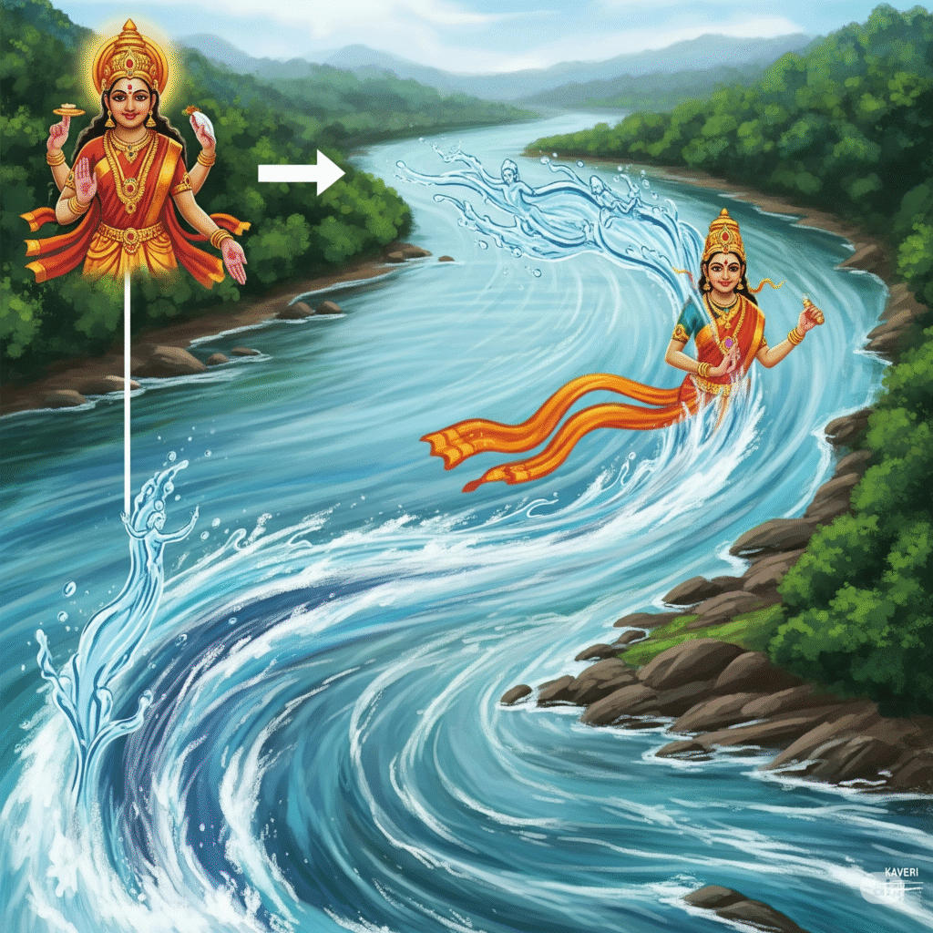 ದಕ್ಷಿಣ ಭಾರತದಲ್ಲಿ ಹುಟ್ಟಿ ಜನರ ಜೀವನದಿಯಾಗಿ ಹರಿಯುವ ಕಾವೇರಿಯ ಉಗಮ ಸ್ಥಾನವಿರುವುದು ತಲಕಾವೇರಿಯಲ್ಲಿ. ವರ್ಷಕ್ಕೊಮ್ಮೆ ನಡೆಯುವ ತುಲಾ ಸಂಕ್ರಮಣದಂದು ತಲಕಾವೇರಿಯ ಪವಿತ್ರ ತೀರ್ಥಕುಂಡಿಕೆಯಲ್ಲಿ ಉದ್ಭವವಾಗುತ್ತಾಳೆ ಕಾವೇರಿ. ಇಂತಹ ಕಾವೇರಿಯು, ಲೋಪಾಮುದ್ರೆಯು ಬ್ರಹ್ಮನ ಮಾನಸಪುತ್ರಿ. ಸಮುದ್ರಮಥನದ ಕೊನೆಯಲ್ಲಿ ಧನ್ವಂತರಿನಾಮಕಪರಮಾತ್ಮನು ಅಮೃತಕಲಶವನ್ನು ತಂದನು. ದೇವಾಸುರರಿಗೆ ಸಮವಾಗಿ ಹಂಚಲು ನಾರಾಯಣನು ಮೋಹಿನೀರೂಪದಲ್ಲಿ ಬಂದನು. ಈ ಮೋಹಿನೀರೂಪಿ ಭಗವಂತನಿಗೆ ಸಹಕರಿಸಲು ಮಹಾಲಕ್ಷ್ಮಿಯು ಲೋಪಾಮುದ್ರೆಯನ್ನು ಸಖಿಯನ್ನಾಗಿ ಕಳುಹಿಸಿದಳು. ಕಾಲಾಂತರದಲ್ಲಿ ಚತುರ್ಮುಖ ಬ್ರಹ್ಮನು ಮಕ್ಕಳಿಲ್ಲದ ಕವೇರ ಋಷಿಗೆ ಲೋಪಾಮುದ್ರೆಯೆಂಬ ಕುಲೋದ್ಧಾರಕಳಾದ ಕನ್ನಿಕೆಯನ್ನು ದಯಪಾಲಿಸುತ್ತೇನೆ’ ಎಂದು ಅನುಗ್ರಹಿಸುತ್ತಾನೆ. ಸಂತುಷ್ಟನಾದ ಕವೇರನು ಪತ್ನಿಯೊಡಗೂಡಿ ಲೋಪಮುದ್ರೆಯನ್ನು ಸ್ವೀಕರಿಸುತ್ತಾನೆ. ಲೋಪಾಮುದ್ರೆಯು ಕವೇರಋಷಿಯ ಮಗಳನ್ನಾಗಿಯು, ಅಗಸ್ತ್ಯಋಷಿಗೆ ಪತ್ನಿಯನ್ನಾಗಿಯು ಮಾಡಿದನು. ಲೋಪಾಮುದ್ರೆಯು ಕವೇರನಿಗೆ ಮಗಳಾದದಿನದಿಂದ ಕಾವೇರಿಯೆಂದು ಪ್ರಸಿದ್ಧಳಾದಳು. ಈ ಕಾವೇರಿಯು ನದಿಯಾಗಿ ಹರಿದು ಲೋಕವನ್ನು ಪಾವನ ಮಾಡಬೇಕೆಂದು ಸಂಕಲ್ಪಿಸಿ ವಿಷ್ಣುವನ್ನು ಕುರಿತು ತಪಸ್ಸಾಚರಿಸಿದಳು. ವಿಷ್ಣುವಿನ ಅನುಗ್ರಹದಿಂದ ಕಾವೇರಿಯು ನದಿಯಾಗಿ ಬ್ರಹ್ಮಗಿರಿಯಿಂದ ನದೀರೂಪವನ್ನು ತಳೆದು ಪವಿತ್ರ ನದಿಯಾಗಿ ಹರಿದು ತನ್ನ ಸಖಿಯಾದ ಮಣಿಕರ್ಣಿಕೆಯೊಡನೆ ಸಮುದ್ರವನ್ನು ಸೇರಿದಳು. ಮತ್ತು ಜಗತ್ತನ್ನು ಪಾವನ ಮಾಡಿದಳು.